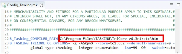 1. Verify the specified compiler path is the path where your compiler is installed. For example, verify and correct the path of the Tasking compiler installation path in Config_Tasking.mk located in <Project_Path>/1_ToolEnv/0_Build/1_Config/Config_Tricore_Tasking.