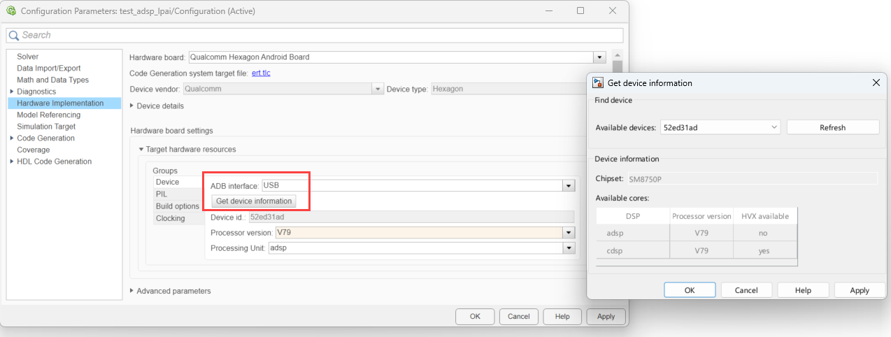 - Set the Hardware Board to - Qualcomm Hexagon Android Board.- The parameter values under Hardware board settings are automatically populated to their default values.  - You can optionally adjust these parameters for your particular use case.