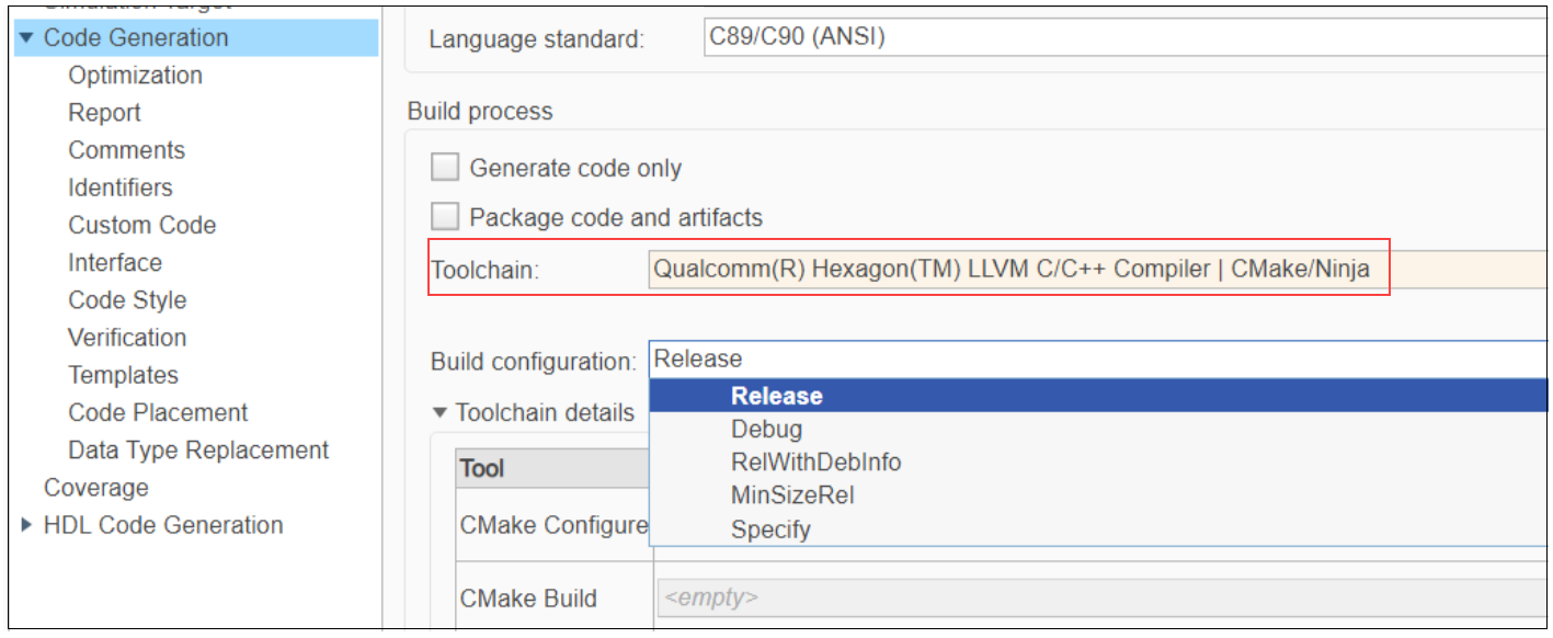 You can select one of the two options available under Configuration Parameters > Code Generation > Toolchain: