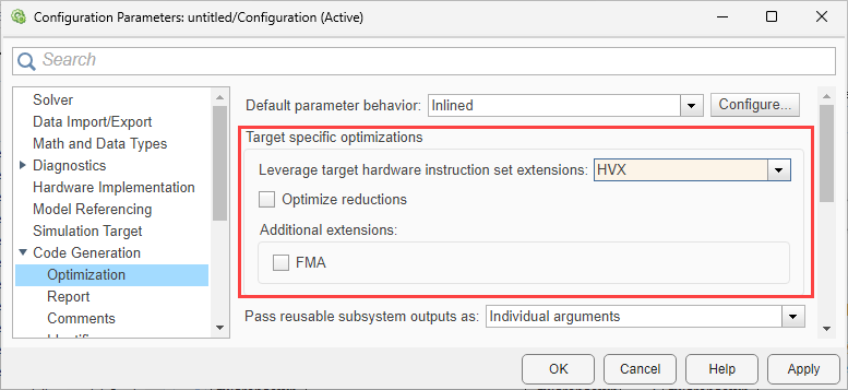 For Hexagon Vector eXtension (HVX), you can select the option to leverage target hardware instruction set extension (ISE). Selecting the HVX option for instruction set extension allows SIMD (Single Instruction, Multiple Data) code generation, which helps to improve the overall performance when you deploy code to Qualcomm Hexagon Android or Qualcomm Hexagon Linux boards. The SIMD code generation is supported for both floating point and fixed point integer (16-bit and 32-bit) operations. Additionally, you can enable the option to optimize reductions for HVX, along with enabling optional support for the fused multiply-add (FMA) extension.