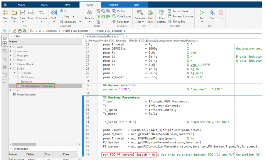 2. In the motorAndInverterParams.m file, set the value of run_FOC_VF_control_switch to 1.