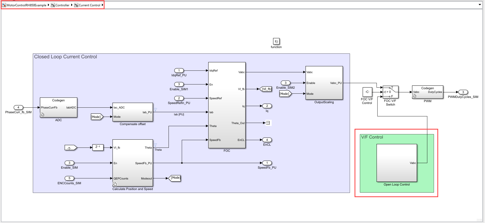 open_system(modelName) The top model MotorControlRH850Example opens. The top-level model in this example comprises of two subsystems CurrentControl and SpeedControl.
