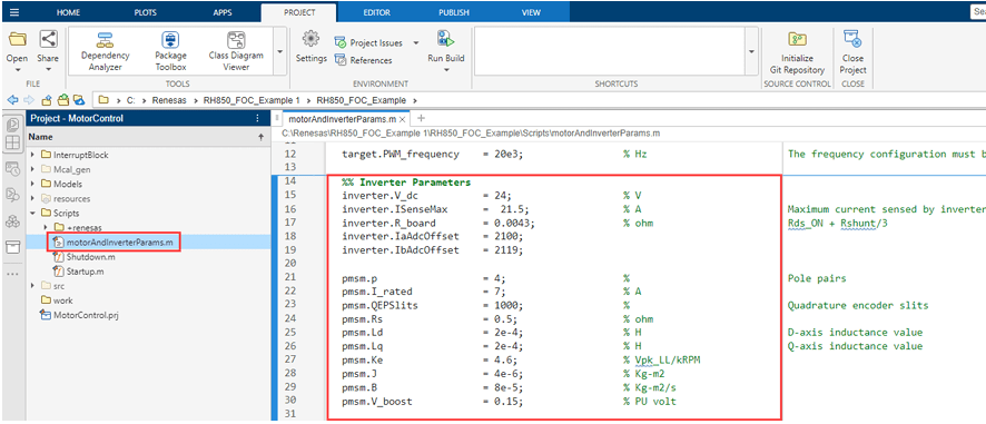3. Update Motor and Inverter board parameters In the motorAndInverterParams.m file, update the motor and Inverter parameters as per your motor and Inverter board.
