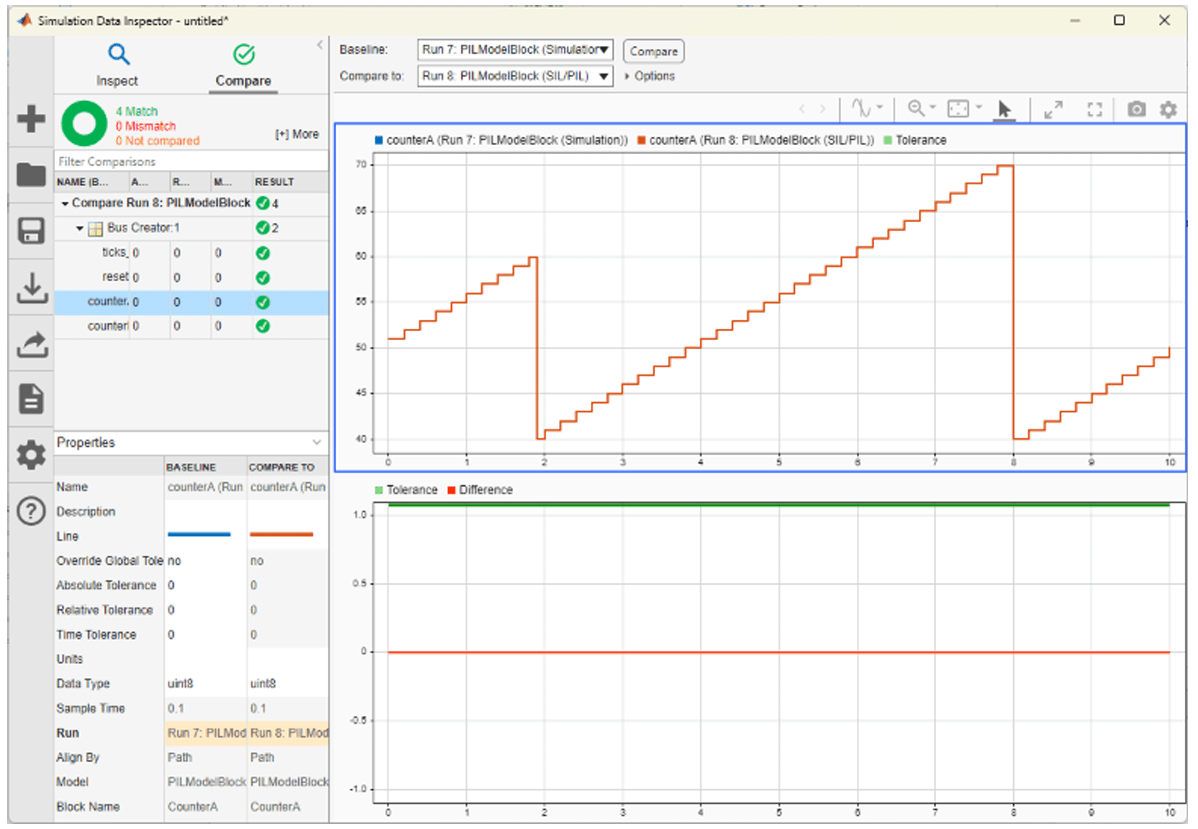 4. Click Run Verification to start the simulation. Compare option displays the numerical equivalence between PIL simulation output and the normal mode simulation output.