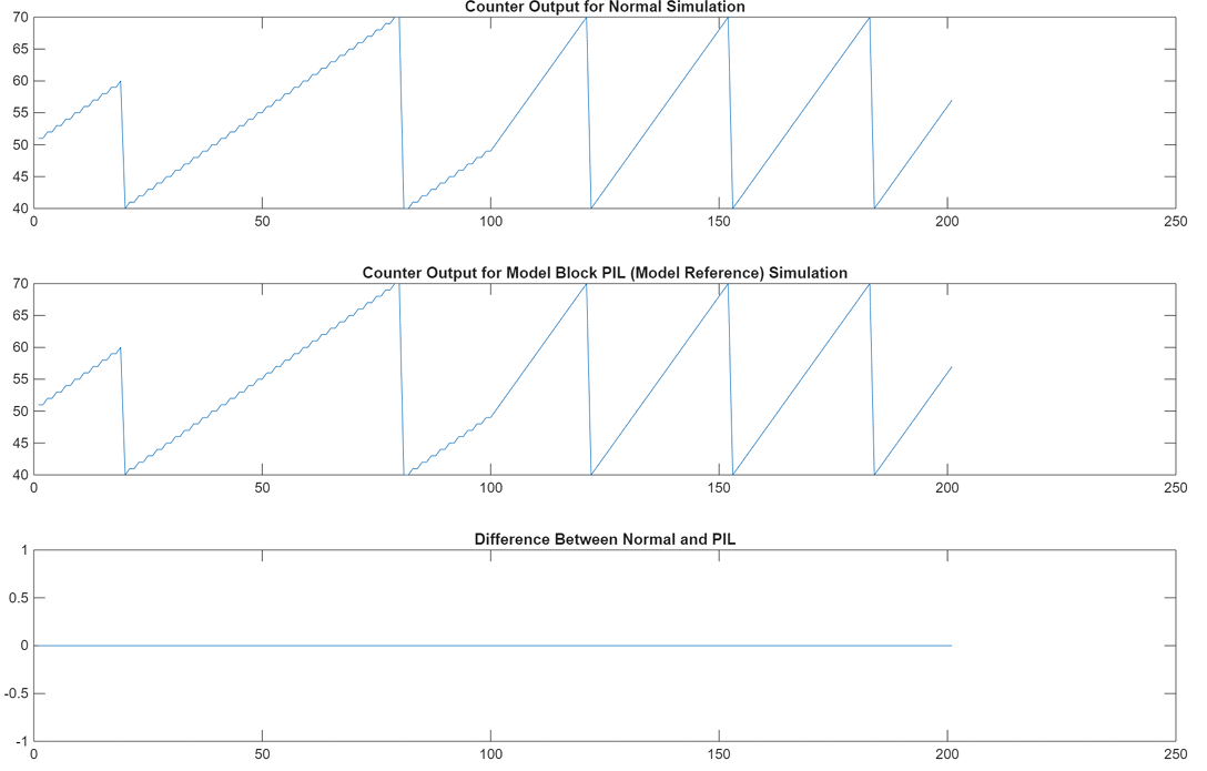 PIL mode: yout2 = out2.logsOut; yout2_pil = yout2.get('counterOut').Values.Data; xout2 = out2.xout; xout2_pil = xout2{1}.Values.Data; Normal Mode: set_param([model '/Counter'],"SimulationMode","Normal"); out2 = sim(model,20); yout2 = out2.logsOut; yout2_normal = yout2.get('counterOut').Values.Data; xout2 = out2.xout; xout2_normal = xout2{1}.Values.Data; fig3 = figure; subplot(3,1,1), plot(yout2_normal), title('Counter Output for Normal Simulation') subplot(3,1,2), ... plot(yout2_pil), title('Counter Output for Model Block PIL (Model Reference) Simulation') subplot(3,1,3), plot(yout2_normal-yout2_pil), ... title('Difference Between Normal and PIL'); fig4 = figure; subplot(3,1,1), plot(xout2_pil), title('State Logging for Normal Simulation') subplot(3,1,2), ... plot(xout2_normal), title('State Logging for Model Block PIL (Model Reference) Simulation') subplot(3,1,3), plot(xout2_normal-xout2_pil), ... title('Difference Between Normal and PIL');