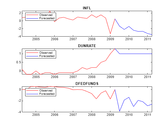 load Data_USEconModel seriesnames = ["INFL" "UNRATE" "FEDFUNDS"]; DataTimeTable.INFL = 100*[NaN; price2ret(DataTimeTable.CPIAUCSL)]; DataTimeTable.DUNRATE = [NaN; diff(DataTimeTable.UNRATE)]; DataTimeTable.DFEDFUNDS = [NaN; diff(DataTimeTable.FEDFUNDS)]; seriesnames(2:3) = "D" + seriesnames(2:3);