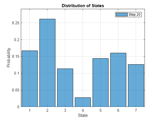 Figure contains an axes object. The axes object with title Distribution of States, xlabel State, ylabel Probability contains an object of type categoricalhistogram. This object represents Step 20.
