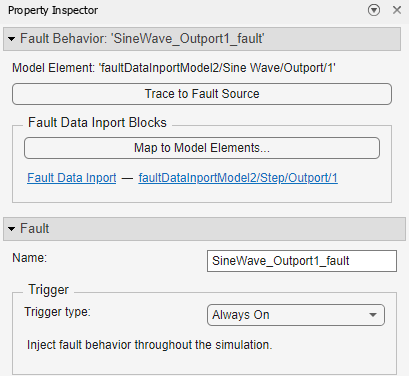 You can add Fault Data Inport blocks to fault behaviors in custom libraries. For more information, see Customize Fault Behaviors by Using Libraries. You must assign the behavior to a fault before you map the block to a signal.