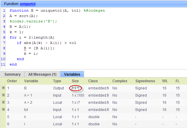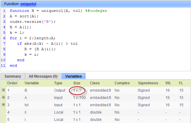Bis used (read). For example:function B = uniquetol(A, tol) %#codegen A = sort(A); coder.varsize('B'); B = A(1); k = 1; for i = 2:length(A) if abs(A(k) - A(i)) > tol B = [B A(i)]; k = i; end endThe function