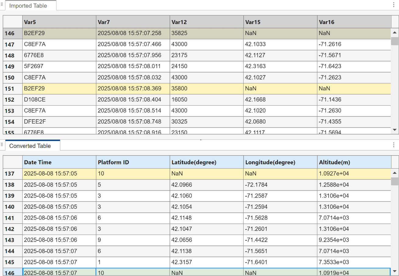 rawTable = readtable("ADSBData.txt",TextType="string"); head(rawTable)