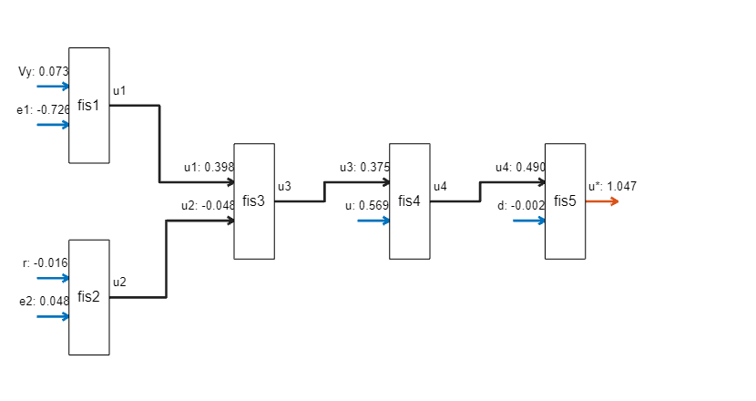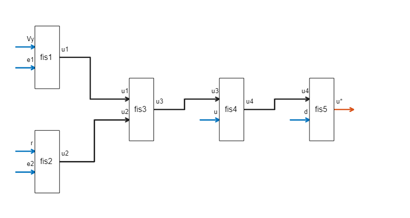 numMFs = 2; fis1 = constructFIS("fis1",numMFs, ... data.vRange,data.e1Range,data.uRange,"Vy","e1","u1"); fis2 = constructFIS("fis2",numMFs, ... data.rRange,data.e2Range,data.uRange,"r","e2","u2"); fis3 = constructFIS("fis3",numMFs, ... data.uRange,data.uRange,data.uRange,"u1","u2","u3"); fis4 = constructFIS("fis4",numMFs, ... data.uRange,data.uRange,data.uRange,"u3","u","u4"); fis5 = constructFIS("fis5",numMFs, ... data.uRange,data.dRange,data.uRange,"u4","d","u*"); fis = [fis1 fis2 fis3 fis4 fis5]; connections = [... fis1.Name+"/"+fis1.Outputs(1).Name fis3.Name+"/"+fis3.Inputs(1).Name; ... fis2.Name+"/"+fis2.Outputs(1).Name fis3.Name+"/"+fis3.Inputs(2).Name; ... fis3.Name+"/"+fis3.Outputs(1).Name fis4.Name+"/"+fis4.Inputs(1).Name; ... fis4.Name+"/"+fis4.Outputs(1).Name fis5.Name+"/"+fis5.Inputs(1).Name ... ]; fisTin = fistree(fis,connections);