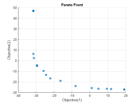 Esta vez, paretosearch encuentra un rango más amplio de funciones objetivo, llegando casi a 10 en el Objetivo 2 y casi a 20 en el Objetivo 1. Este rango es similar al rango gamultiobj, excepto por el punto de solución anómalo cerca del Objetivo 1 = –31, Objetivo 2 = 48.