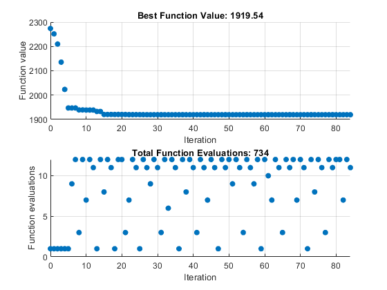 'GSSPositiveBasis2N'poll method. Turn off the display.opts = optimoptions('patternsearch','PollMethod','GSSPositiveBasis2N',... 'PlotFcn',{@psplotbestf,@psplotfuncount},'Display','none');