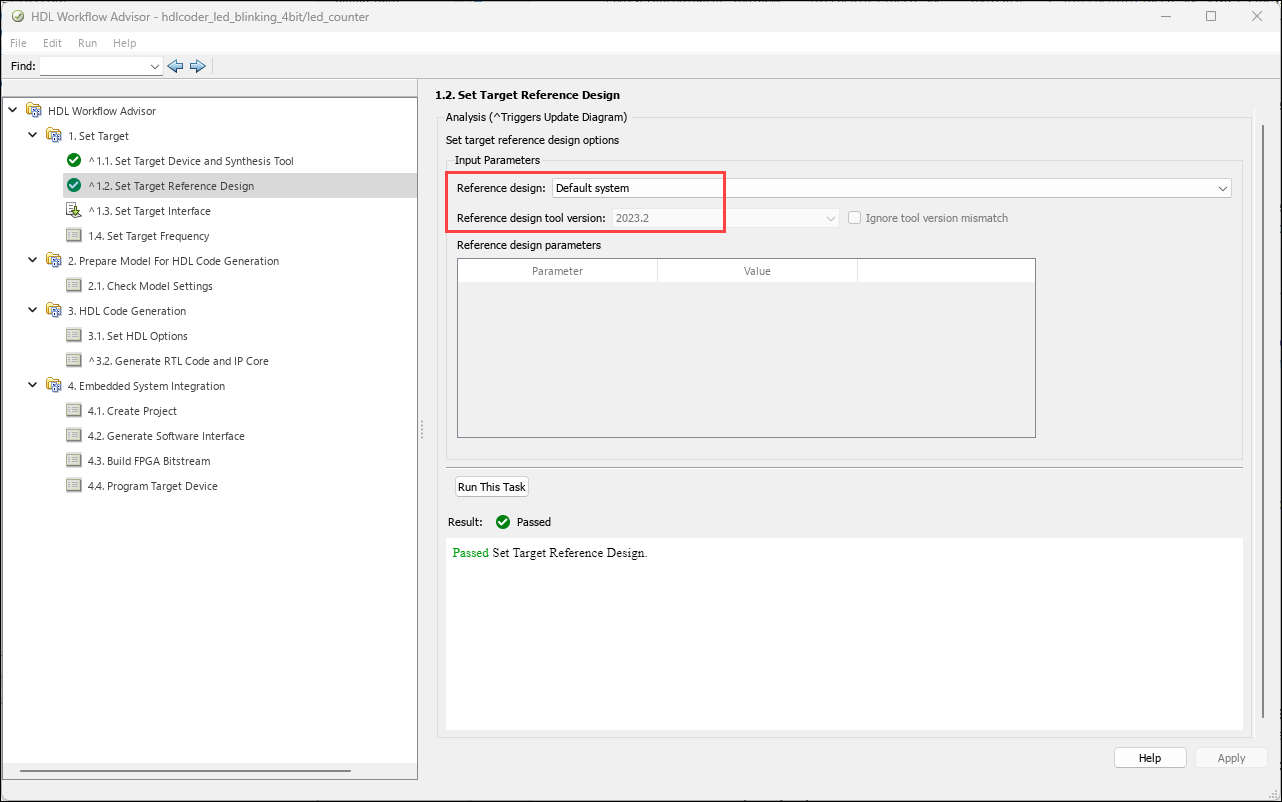 6. In the Set Target > Set Target Reference Design task, set the Reference design field to Default system and click Run This Task.