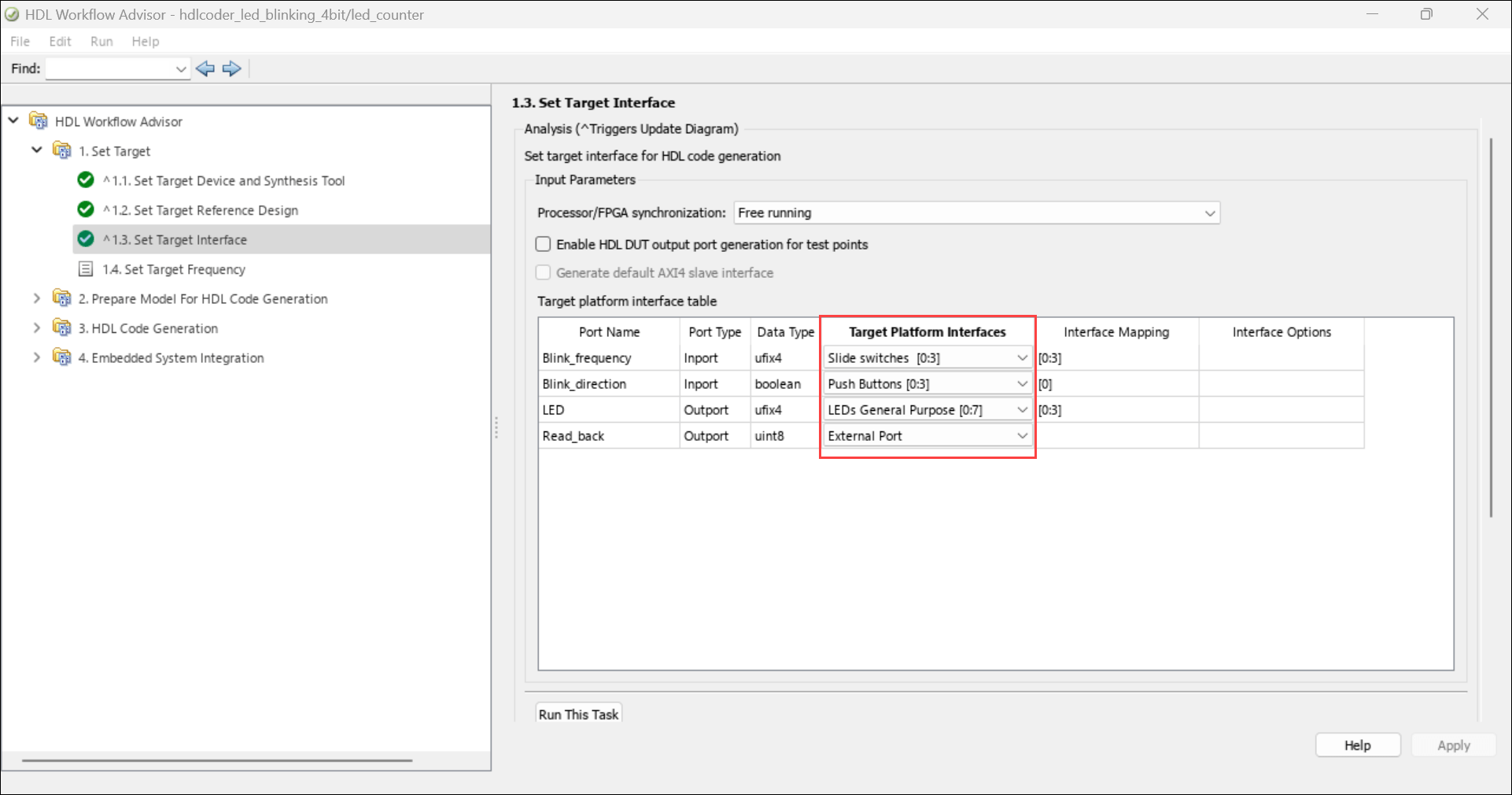 7. In the Set Target Interface task, set the Target Platform Interface options and click Run This Task.