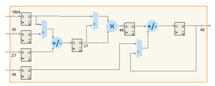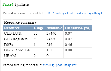 The DSP_subsys2 implements the same operation by using bit widths that match the DSP on a Xilinx UltraScale FPGA. If you deploy this subsystem onto a Xilinx Artix UltraScale® FPGA, you will see that the entire design fits onto a single DSP slice.
