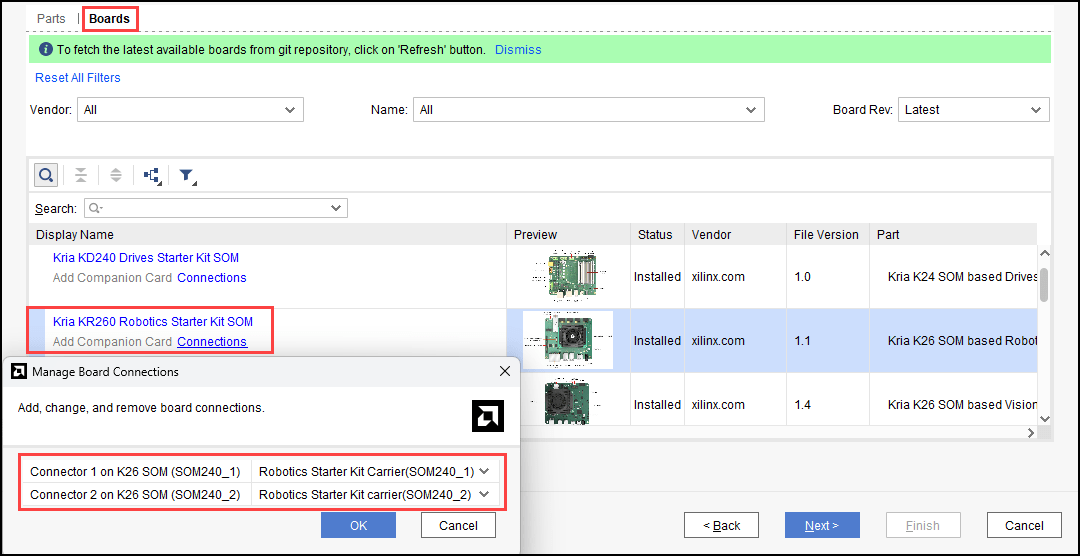 1. Open Xilinx Vivado and create an RTL project by adding the necessary source files and the constraint files. In the board selection step, click the Boards tab and select AMD Kria KR260 Robotics Starter Kit SOM as the target device. If you want to add the companion card and manage the connections to the SOM, click the Connections option as shown below.