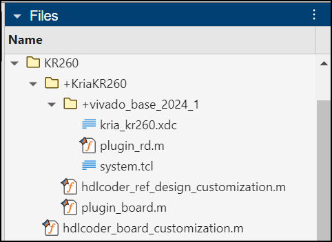 The reference design plugin folder, +vivado_base_2024_1, must also contain the design files, such as, system.tcl, that you export from the Xilinx Vivado project. The reference design definition file plugin_rd.m uses the addCustomVivadoDesign function to identify the SoC design project.