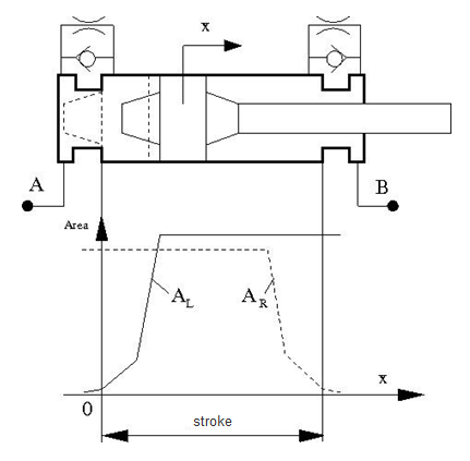 To ensure cushioning on both sides of the stroke, set the variable orifice area of the left cushion (AL) and the right cushion (AR) similar to the profile shown in the figure. The origin of the plot is located at the position where the piston touches the cap. If the cylinder acts in the negative direction, the piston displacements are negative, and you must make the profile specification in the fourth quadrant.