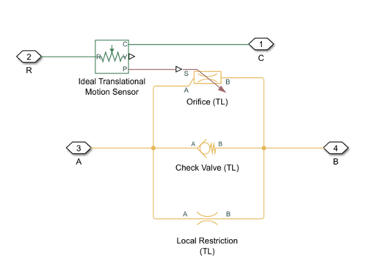 Ports A and B are thermal liquid conserving ports associated with the chamber inlet and outlet, respectively. Port R is a mechanical translational conserving port connected with the piston plunger. Port C is a mechanical translational conserving port that corresponds to the cylinder clamping structure. The block cushions the flow rate from port B to port A. The check valve in the block is oriented from port A to port B.