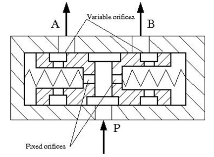 The flow from the source enters the valve through port P and is split into two parts flowing through the P–A and P–B paths. Each path contains a fixed orifice and a variable orifice. The fixed orifices must be precisely matched to divide flow in equal parts, or arranged in a certain proportion if unequal division is required.