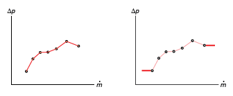 The pressure drop is calculated as a function of mass flow rate from tabulated data specified at some reference pressure and temperature. The calculation is based on linear interpolation if the mass flow rate is within the bounds of the tabulated data and on nearest-neighbor extrapolation otherwise. In other words, neighboring data points connect through straight-line segments, with those at the mass flow rate bounds extending horizontally outward.