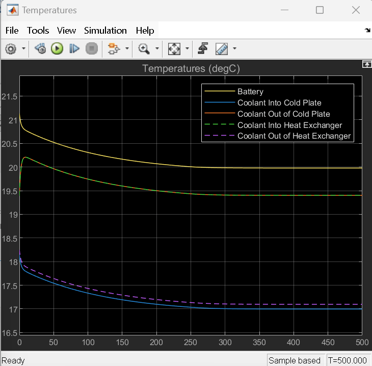 In the full model, the battery is maintained at a temperature of 20.0 degC and generates 10.1 kW heat. The evaporator cools the coolant from 19.4 degC to 17.1 degC. The temperatures in the full model slightly deviate from the temperatures in the harness due to the effects of the pump, tank, and valve in the closed loop system.