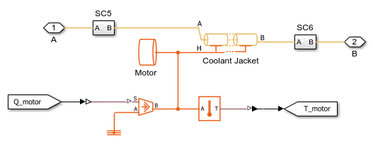 The motor, charger, inverter, and DCDC subsystems are the same. The motor is shown below. Each of the four subsystems models a coolant jacket around the motor, charger, inverter, or DC-DC converter, represented by a heat flow rate source and a thermal mass.