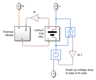 Each battery pack model contains a stack of lithium-ion cells coupled with a thermal model. The power losses in the cells correspond to the generated heat.