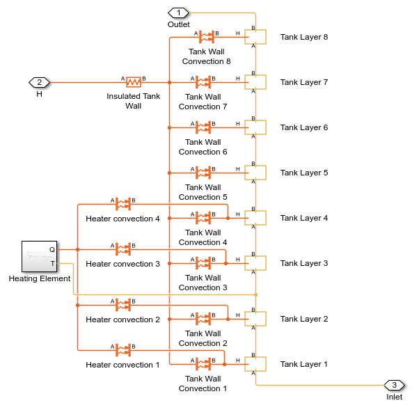 The tank is modeled using eight discrete layers to capture the temperature gradients. Each tank layer is modeled by a custom Simscape™ component. The custom Simscape components are modified constant volume chamber blocks that include the effects of the elevation change from one port to the other, including hydrostatic pressure and convection due to buoyant circulation. To simplify the calculation, the components do not compute the mass transfer due to buoyant circulation and only calculate the effective energy transfer due to fluid of different temperatures entering and leaving the tank layer. The components approximate energy transfer due to buoyant circulation using a simple convection equation and two different convection coefficients, one for upward heat flow and one for downward heat flow. The two convection coefficients recreate the fundamentally asymmetric relation of buoyant circulation, in which less dense (warmer) fluid tends to rise, while the more dense (cooler) fluid tends to fall.