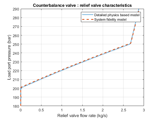 You can use this model to generate and compare the relief valve stage characteristics of the counterbalance valve for the variant subsystems using CounterbalanceValveWithTestHarnessReliefCharacteristics script. To test for the relief valve characteristics, you can ramp up the pressure at the load port while keeping the pressure constant at the back port.