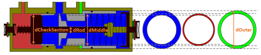The Check Valve Function models the mass dynamics of the check stage poppet (Black colored body). The check stage operation allows the free upstream flow from the pBack port to the pLoad port of the counterbalance valve.