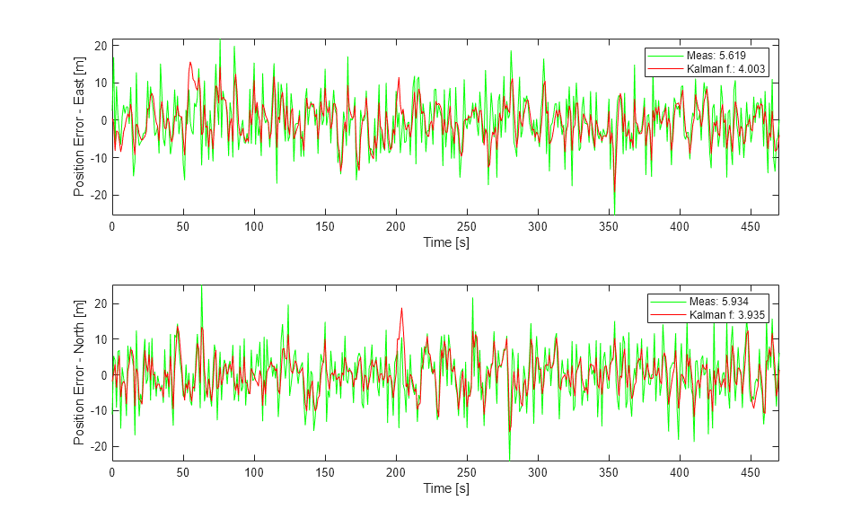 % East position measurement error [m] n_xe = y(:,1)-x(:,1); % North position measurement error [m] n_xn = y(:,2)-x(:,2); % Kalman filter east position error [m] e_xe = xhat(:,1)-x(:,1); % Kalman filter north position error [m] e_xn = xhat(:,2)-x(:,2); figure; % East Position Errors subplot(2,1,1); plot(t,n_xe,'g',t,e_xe,'r'); ylabel('Position Error - East [m]'); xlabel('Time [s]'); legend(sprintf('Meas: %.3f',norm(n_xe,1)/numel(n_xe)),sprintf('Kalman f.: %.3f',norm(e_xe,1)/numel(e_xe))); axis tight; % North Position Errors subplot(2,1,2); plot(t,y(:,2)-x(:,2),'g',t,xhat(:,2)-x(:,2),'r'); ylabel('Position Error - North [m]'); xlabel('Time [s]'); legend(sprintf('Meas: %.3f',norm(n_xn,1)/numel(n_xn)),sprintf('Kalman f: %.3f',norm(e_xn,1)/numel(e_xn))); axis tight;