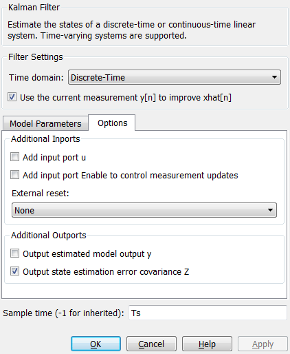 Seleccione la casilla de verificación Output state estimation error covariance Z. La matriz Z ofrece información acerca de la confianza del filtro en las estimaciones del estado.