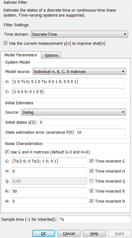 ![$$ G = \left[ \begin{array}{c c} T_s/2 & 0 \\ 0 & T_s/2 \\ 1 & 0 \\ 0 & 1 \end{array} \right] $$](kalmanfilterblockexample_eq16207734140479593349_es.png)