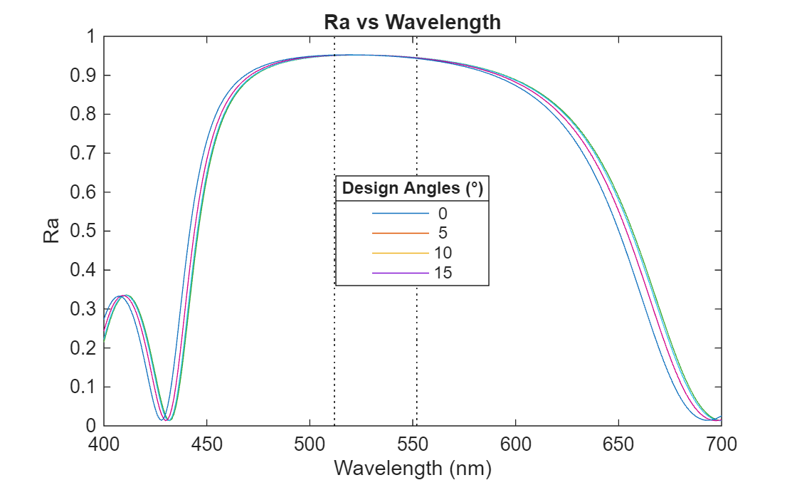 Compute the average reflectivity, Ra, across the range of design wavelengths and angles. Observe the shift in reflectivity toward shorter wavelengths at higher incident angles, a phenomenon known as "blue-shift" that results from the increased effective refractive index at oblique incidence.