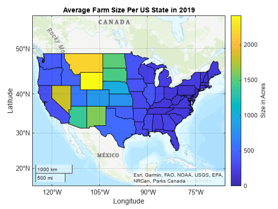 title("Average Farm Size Per US State in 2019") cb = colorbar; cb.Label.String = "Size in Acres";