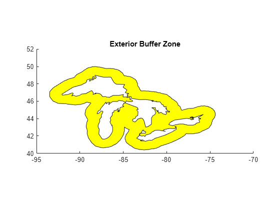 [latb,lonb] = bufferm(lat,lon,bufwidth) computes the buffer zone around a line or polygon. If the vectors lat and lon, in units of degrees, define a line, then latb and lonb define a polygon that contains all the points that fall within a certain distance, bufwidth, of the line. bufwidth is a scalar specified in degrees of arc along the surface. If the vectors lat and lon define a polygon, then latb and lonb define a region that contains all the points exterior to the polygon that fall within bufwidth of the polygon.