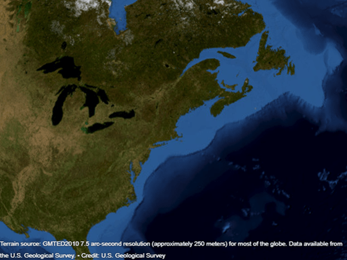 Mapping Toolbox™ includes a raster MBTiles file with low-resolution USGS imagery called usgsimagery.mbtiles. Create a custom basemap from the file and display it using a geographic globe. Position the camera 3200 kilometers above Boston.