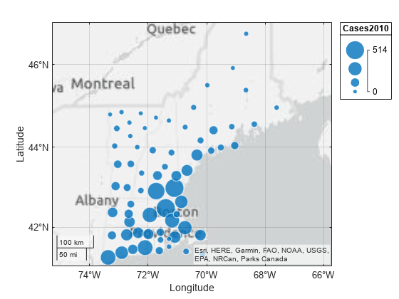 gb = geobubble(counties,'Latitude','Longitude','SizeVariable','Cases2010'); geolimits(gb,[41 47],[-75 -66])