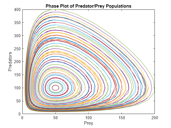 y0 = 10:10:400; for k = 1:length(y0) [t,p] = ode45(@lotkaODE,[t0 tfinal],[50 y0(k)]); plot(p(:,1),p(:,2)) hold on end title('Phase Plot of Predator/Prey Populations') xlabel('Prey') ylabel('Predators') hold off