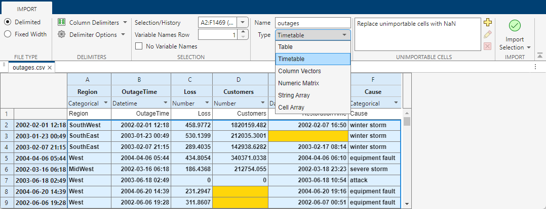 For example, open the outages.csv sample file by using uiimport and which to get the path to the file.