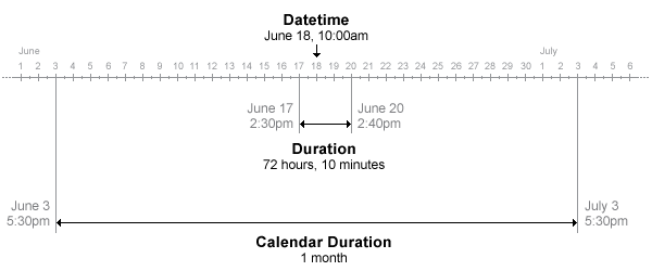 • To represent a length of time in units of fixed length, use the duration data type. When using the duration data type, 1 day is always equal to 24 hours, and 1 year is always equal to 365.2425 days. For example, represent 72 hours and 10 minutes using hours and minutes.