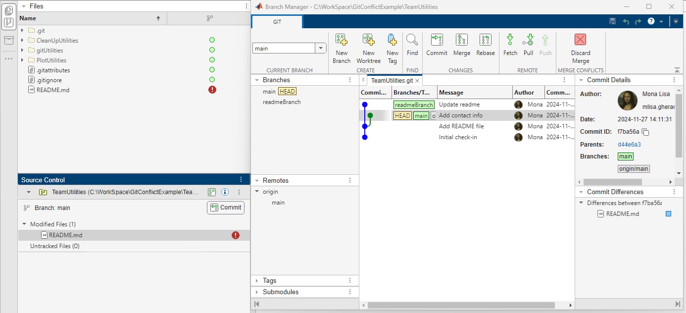 This example shows how to resolve a conflict when you collaborate on files that are under Git™ source control. You create a new branch, make changes, then merge the changes into the main branch. The branch merge causes a conflict.