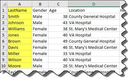 Preview the data in patients.xls. Notice the text data in the column LastName. Only a preview of the first 10 rows is shown here.