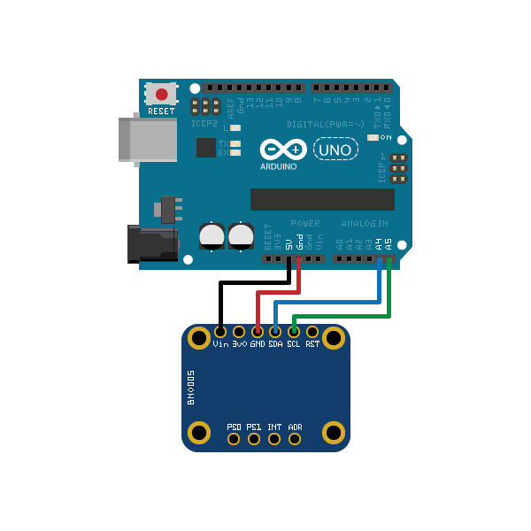 To work with Adafruit\BNO055 add-on, connect the BNO055 sensor to your Arduino® Hardware as shown in the image.