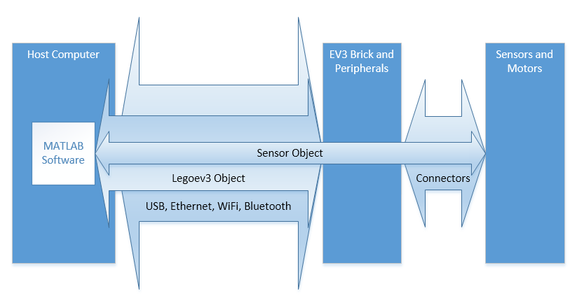 When you use MATLAB® to interact with the EV3 hardware, you rely on several types of connections: