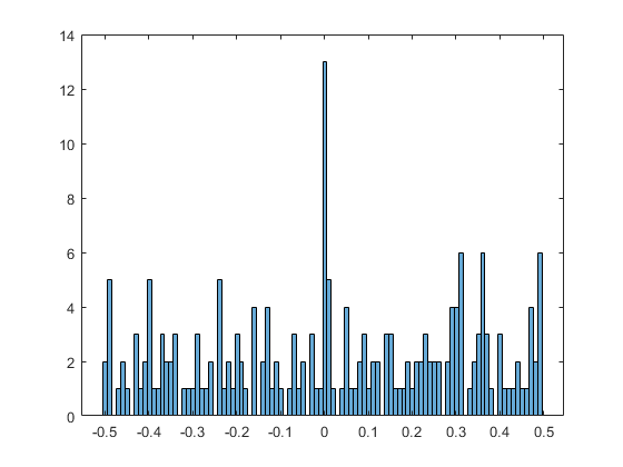 Represente un histograma de las diferencias. El histograma, que está distribuido de manera relativamente uniforme, muestra que la forma exp(pi*n) no genera muchos casos de casi enteros. Para este ejemplo específico, ningún casi entero tiene un error de redondeo inferior a 0,0001.