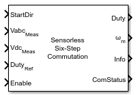 The Sensorless Six-Step Commutation block uses six-step commutation to run a Brushless DC Motor (BLDC) motor or Permanent Magnet Synchronous Motor (PMSM) using sensorless control.