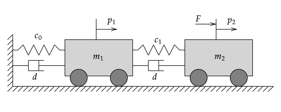 The plant for this example is a mass-spring-damper, consisting of two carts of mass m1 and m2, connected to each other and the ground through springs with the stiffness coefficients c0 and c1 and dampers with the damping coefficient d.